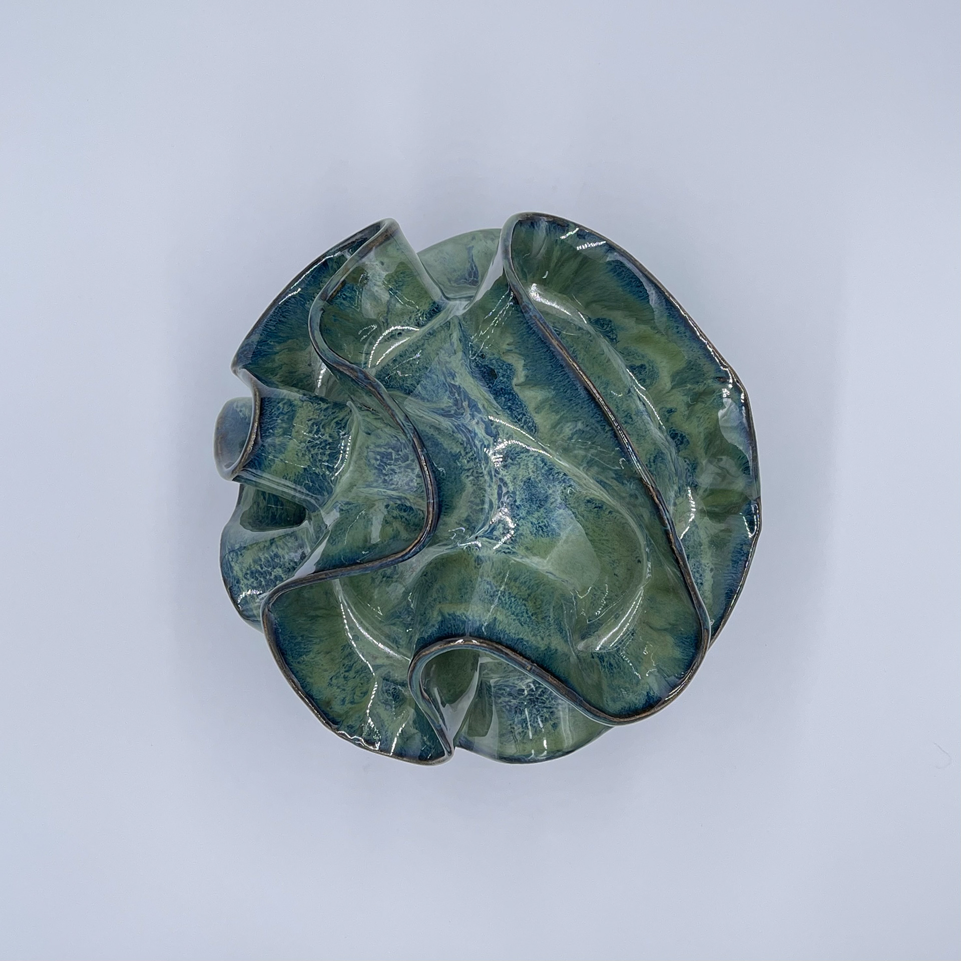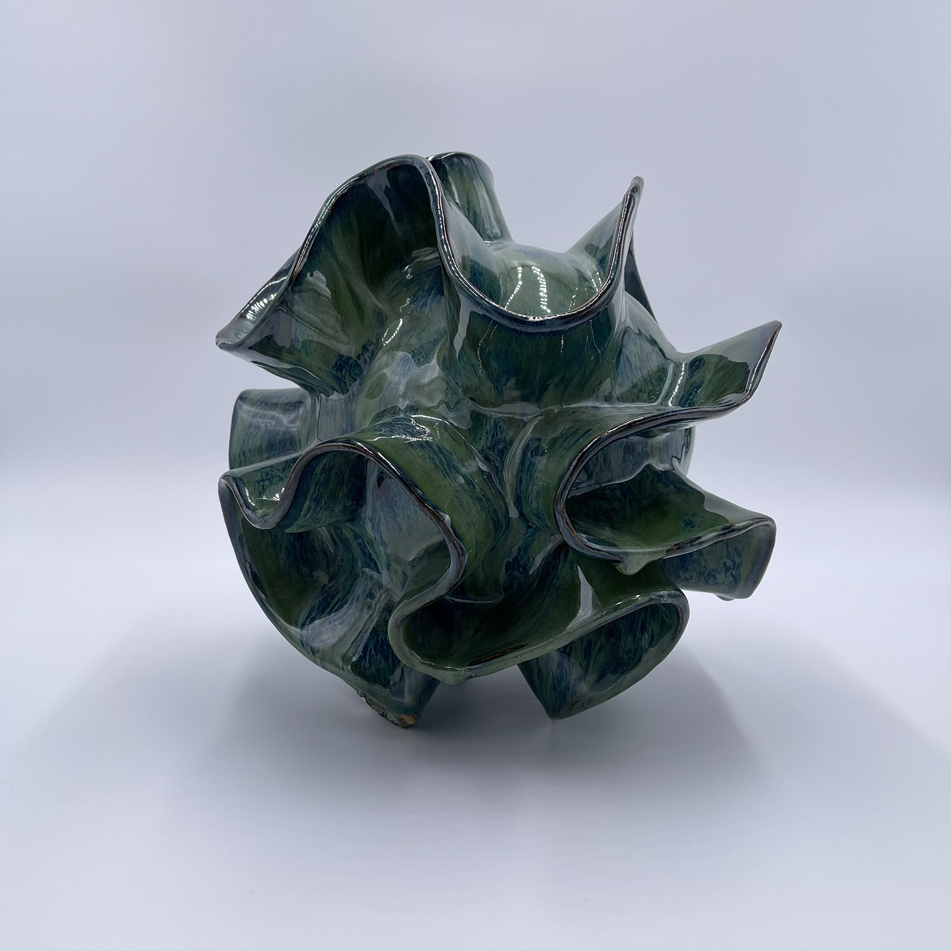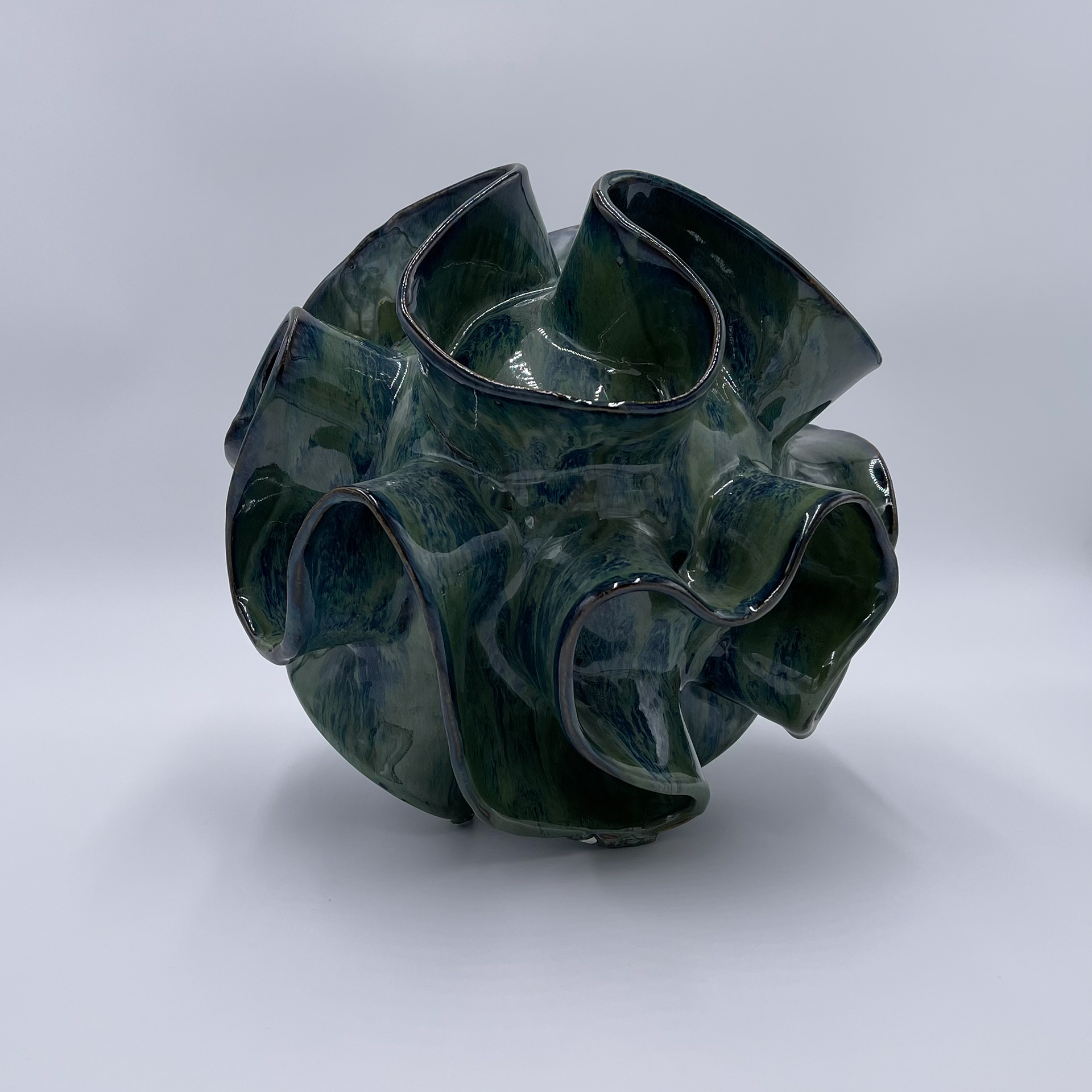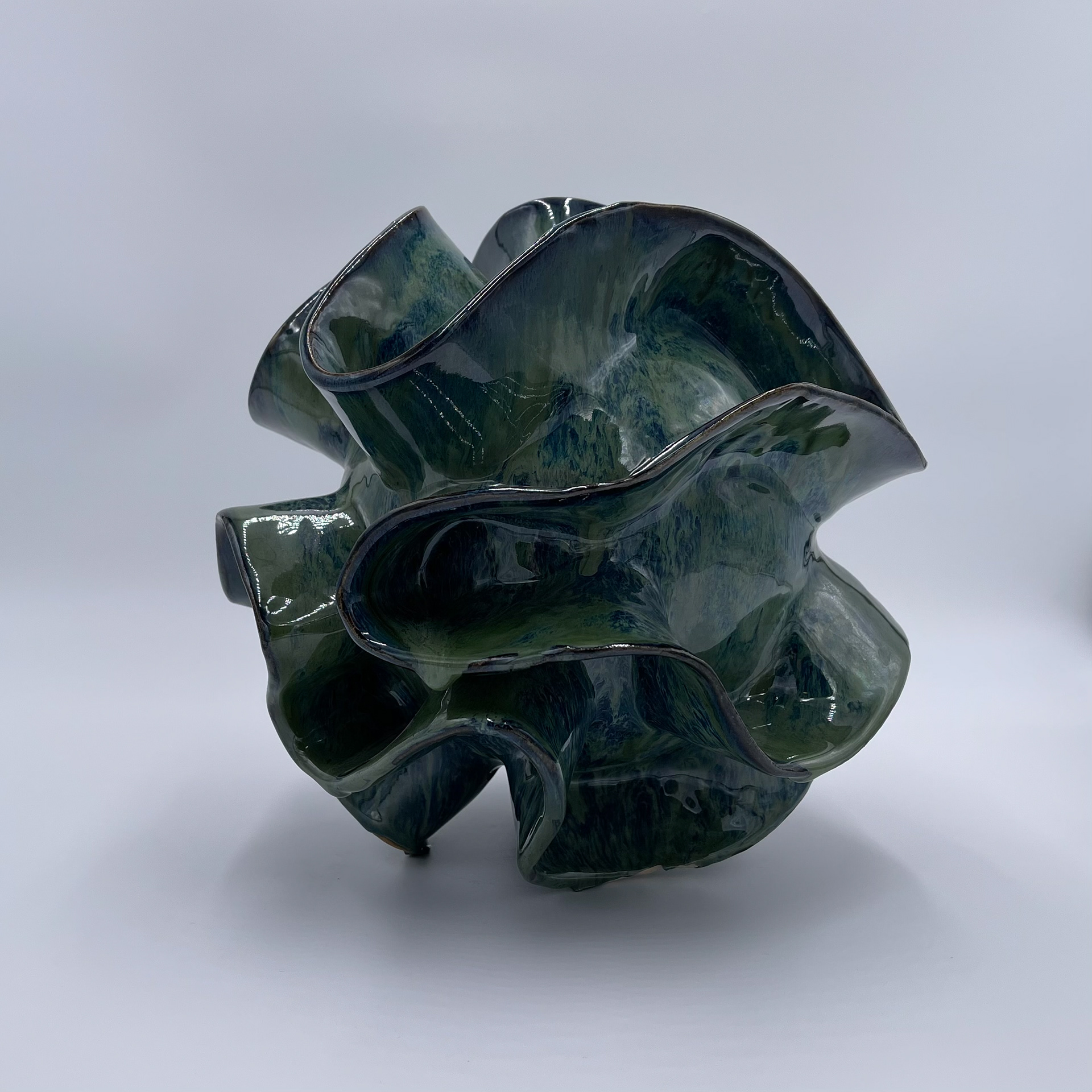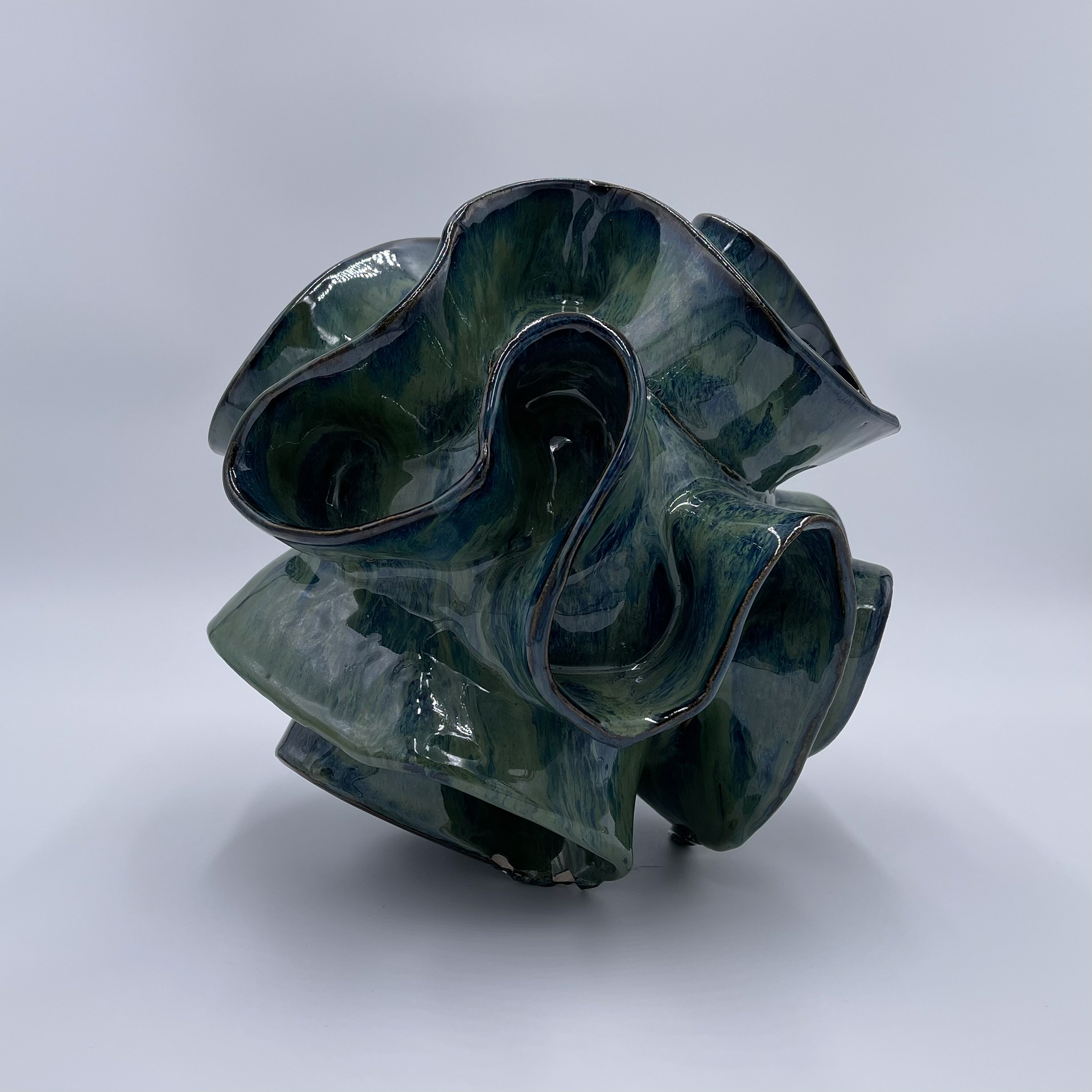 Organic coral form finished in green and blue high-fire glaze with palladium high-fire glaze highlights